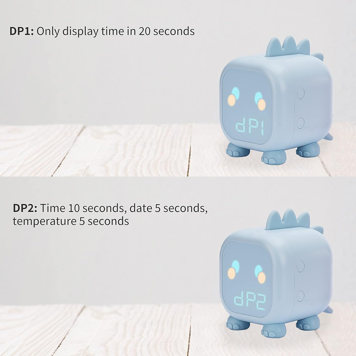 Ceas desteptator digital pentru copii, Edillas, model dinozaur, alarma duala, antrenament somn, lumina de veghe LED, USB-C, albastru deschis - GRAD A